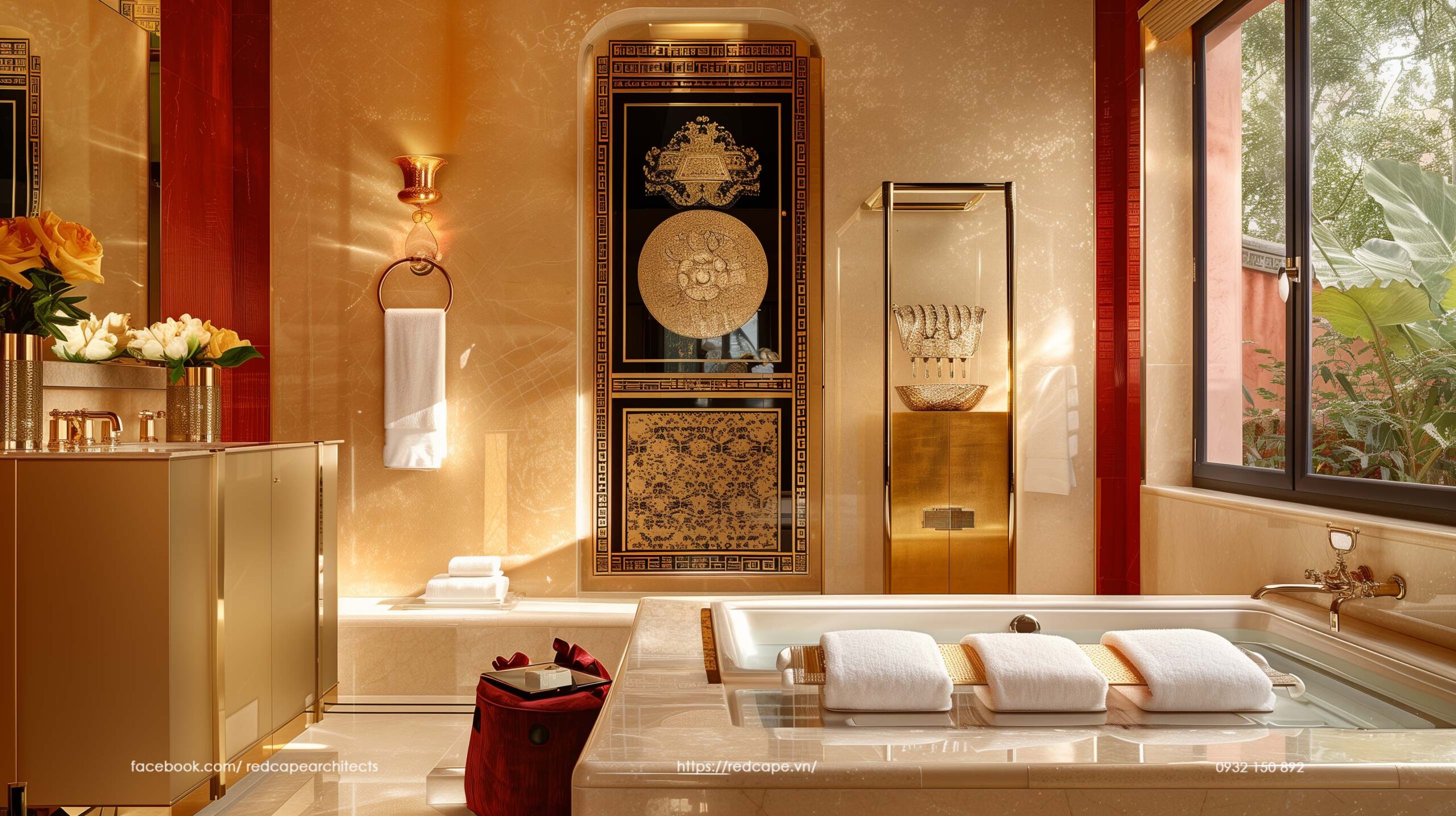 Một nét phá cách nhỏ với vật liệu đồng thau không chỉ mang đến sự ấm cúng, mà còn phản chiếu lịch sử và táo bạo một cách tinh tế qua từng thiết kế, từ đèn chùm lộng lẫy đến tay nắm cửa mạnh mẽ, từ bồn tắm sang trọng đến khung cửa sổ rộng lớn hướng hồ.